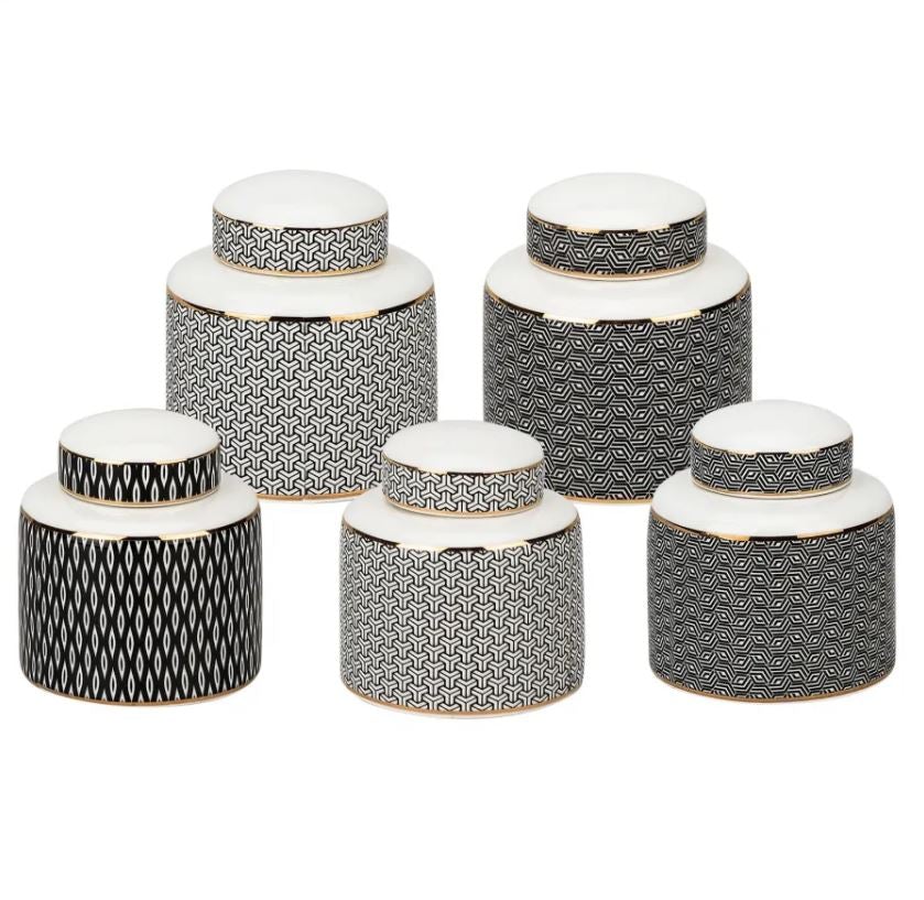 Le set de 5 pots à épices Karaca Bronx s'adaptera facilement à votre cuisine avec l'harmonie de ses couleurs noir, blanc et doré. Ce set vous permettra de préserver la fraîcheur de vos épices pour une utilisation optimum. Karaca Bronx se compose de 5 pots en porcelaine de différentes tailles et couvercles fabriqués de la même matière.