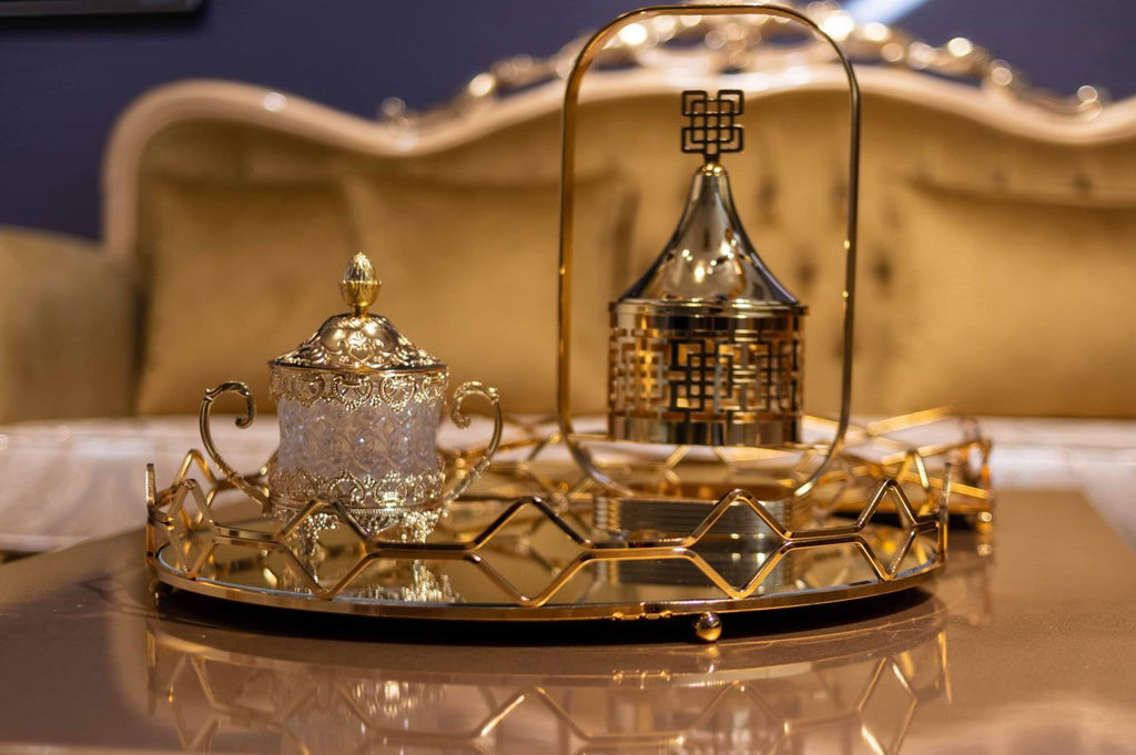 Plateau de service ovale en métal de couleur doré avec miroir. Très élégant et décoratif. C'est un produit idéal pour servir des pâtisseries avec accompagnement thé ou café.