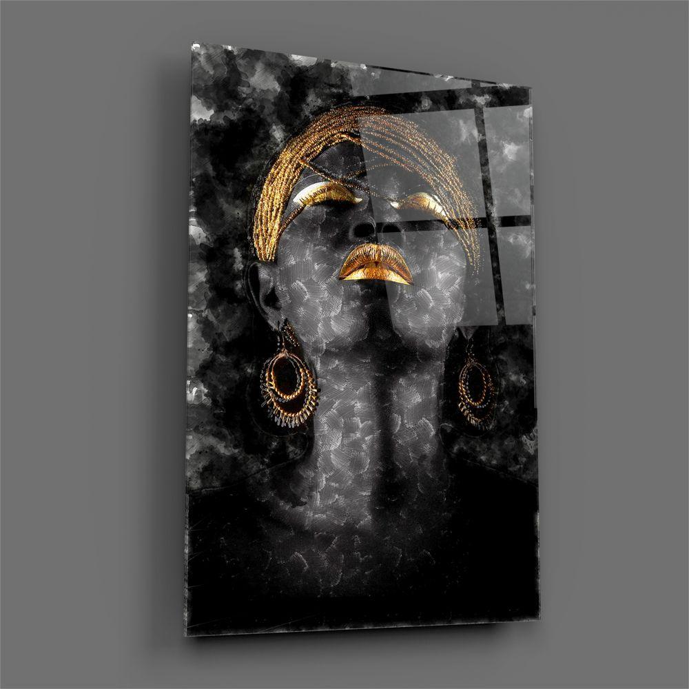 Tableau en verre - Femme africaine avec maquillage dorés et bijoux - Fond noir