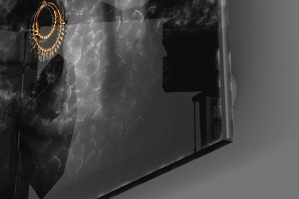 Ce tableau sur verre est une déclaration de design intérieur audacieuse qui combine l'attrait d'une impression photographique moderne avec la dureté et la brillance du verre. Elle représente une dame sensuelle parée de fils ethniques et de bijoux, elle est prise à mi-chemin alors qu'elle est en pleine sérénité dans des pensées profondes, sa peau brille. Les nuances monochromes de cet art mural photographique donnent encore vie à la chute des textures et des formes.